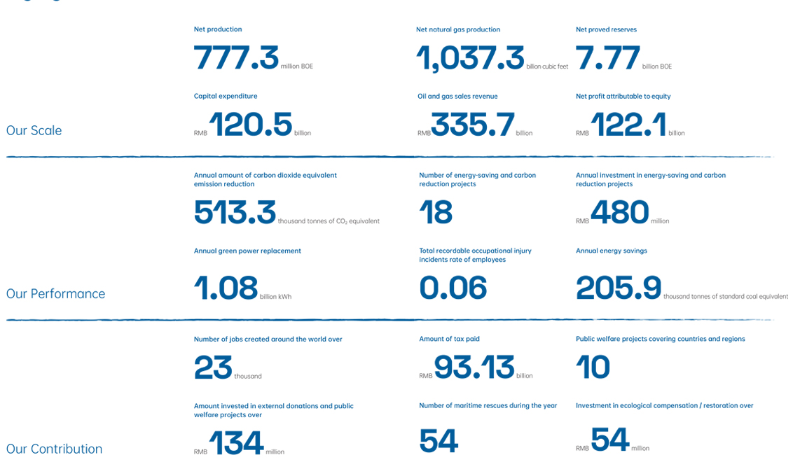 CNOOC Limited is a listed company on the Shanghai Stock Exchange and the Hong Kong Stock Exchange with stock codes of 600938 and 00883, respectively. The Company is the largest producer of offshore crude oil and natural gas in China and one of the largest independent oil and gas exploration and production companies in the world. The Company mainly engages in exploration, development, production and sale of crude oil and natural gas.