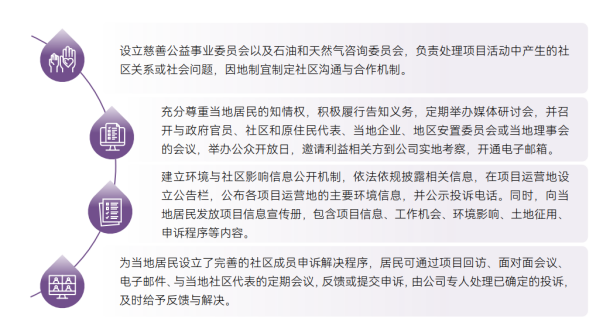 中國海油尊重當(dāng)?shù)鼐用竦娘L(fēng)俗習(xí)慣和文化傳統(tǒng),致力于尊重、捍衛(wèi)和保護(hù)人權(quán),重視生態(tài)環(huán)境保護(hù),承諾不在保護(hù)區(qū)內(nèi)作業(yè),最大限度減小公司運(yùn)營給當(dāng)?shù)厣鐓^(qū)帶來的不良影響。公司遵循自由自愿、事先知情的認(rèn)可權(quán)﹙FPIC)原則,積極開展社區(qū)溝通工作,協(xié)同當(dāng)?shù)卣⒎钦M織、社區(qū)代表等,建立多樣化溝通渠道,通過對話、申訴解決程序和社區(qū)影響管理措施,充分了解當(dāng)?shù)鼐用駥τ诠鹃_展生產(chǎn)建設(shè)活動的看法與建議,及時(shí)評估項(xiàng)目對于社區(qū)的影響,識別社區(qū)相關(guān)潛在風(fēng)險(xiǎn)與機(jī)遇。
